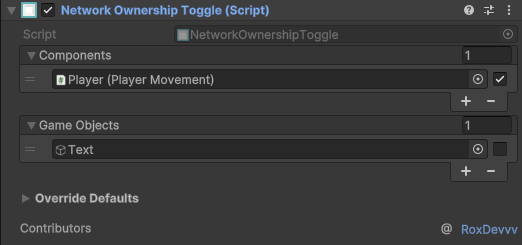 In the example above, PlayerMovement would be enabled only for the owner and disabled for others while the Text GameObject would be disabled for the owner but active for others.