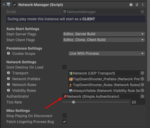 To use your custom authenticator add it somewhere on your scene as a component and link it to your network manager like so: